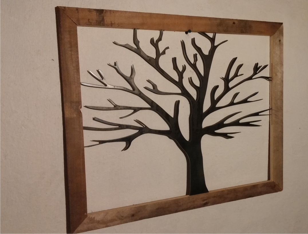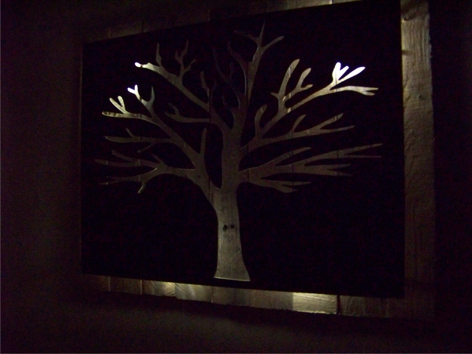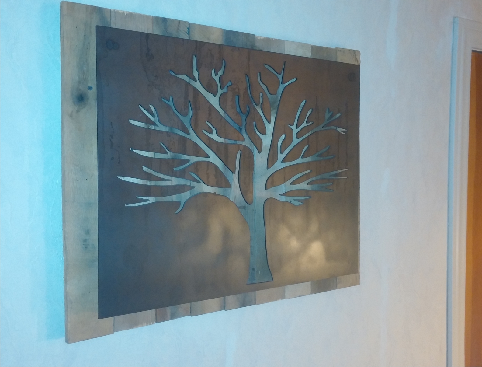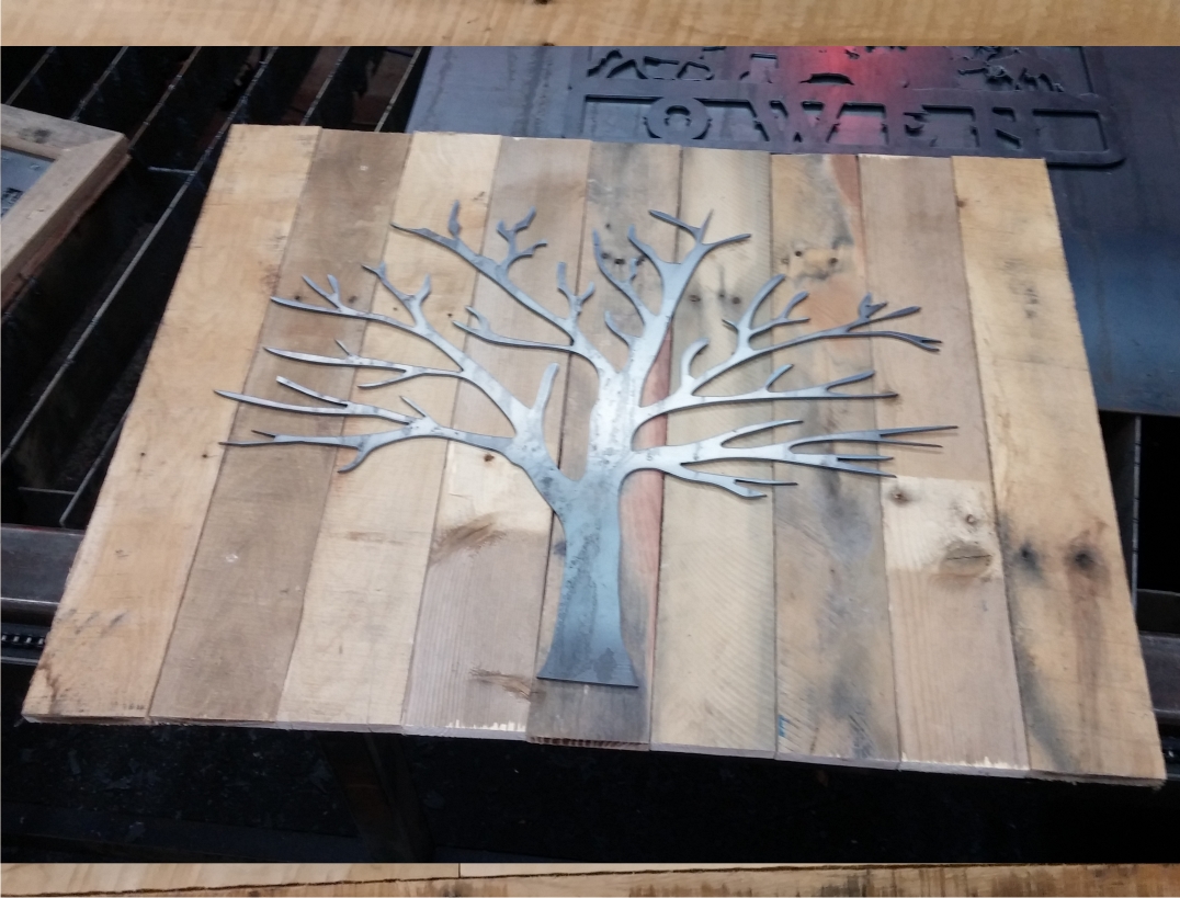 metal cut out tree with reclaimed wood backdrop finished with
