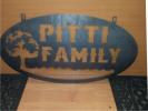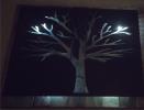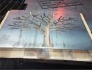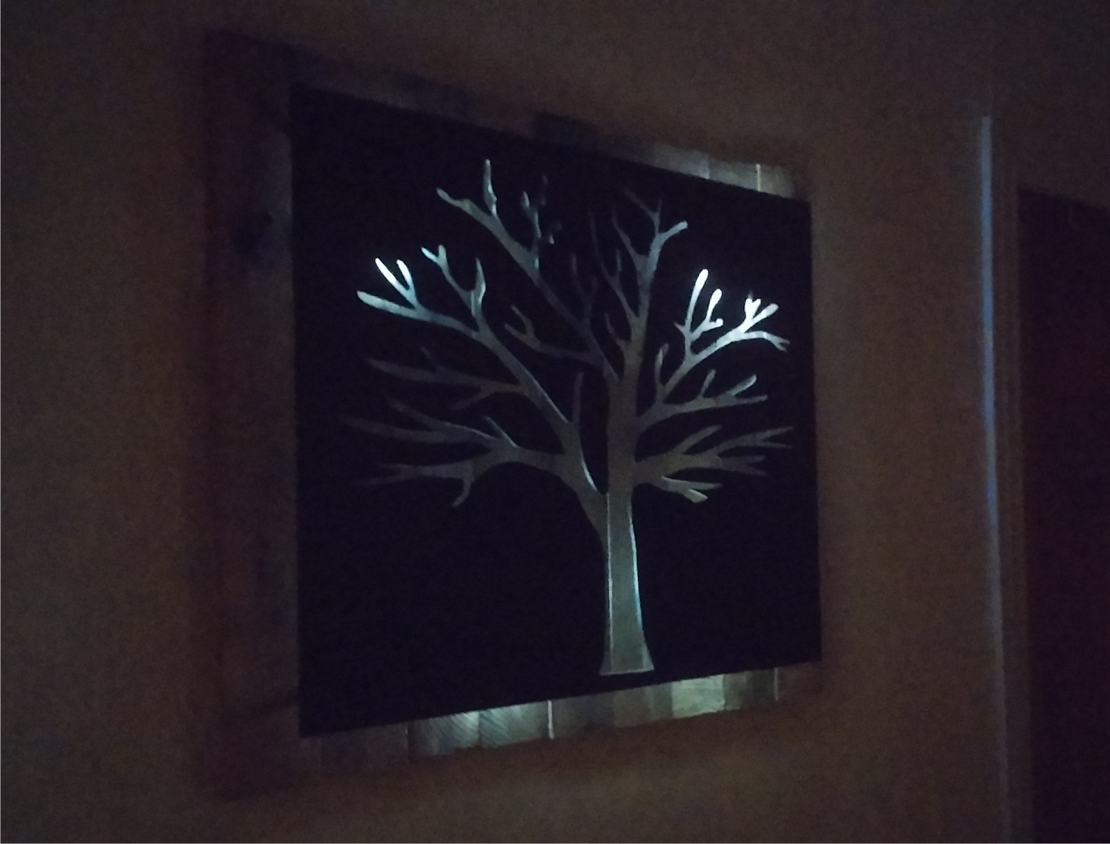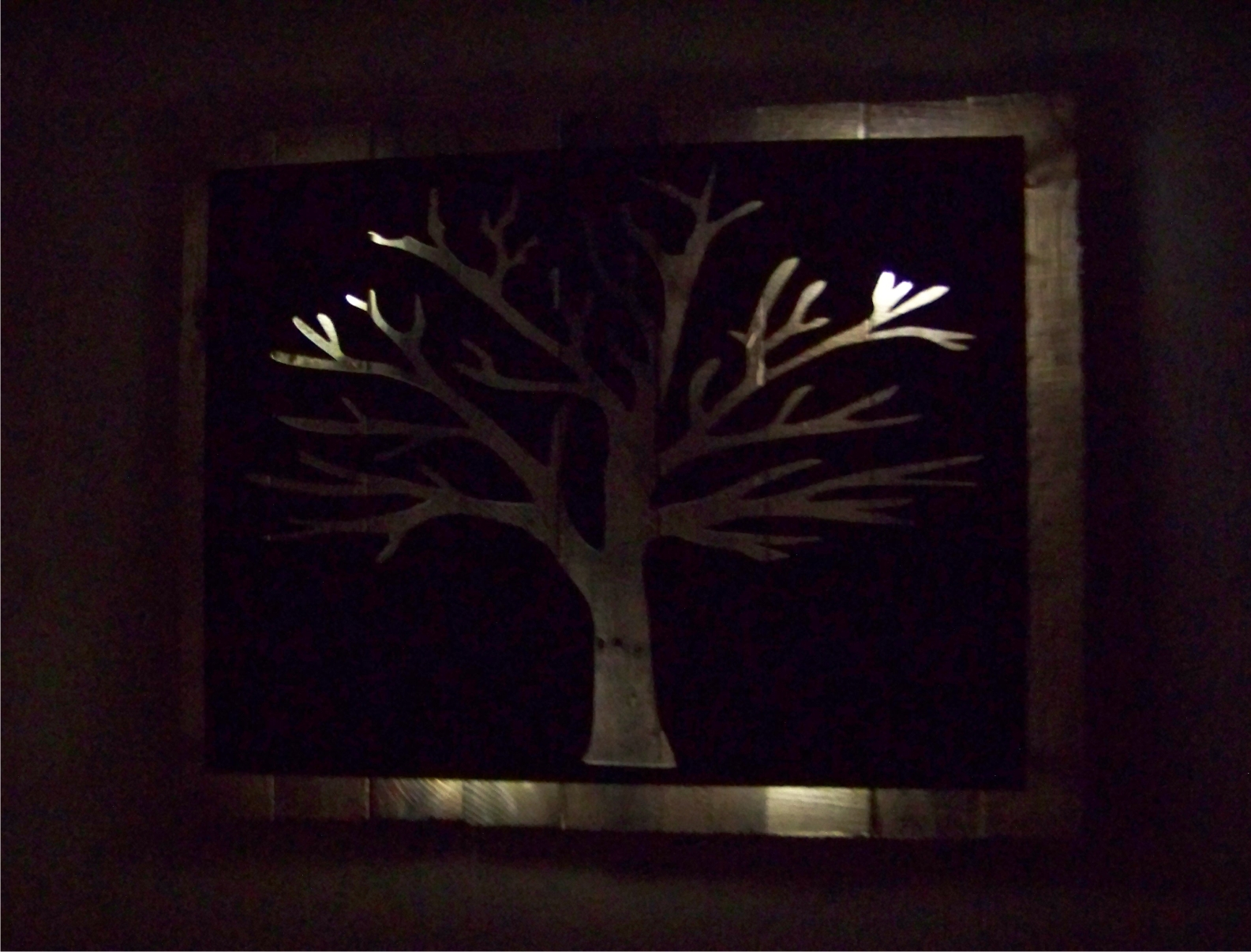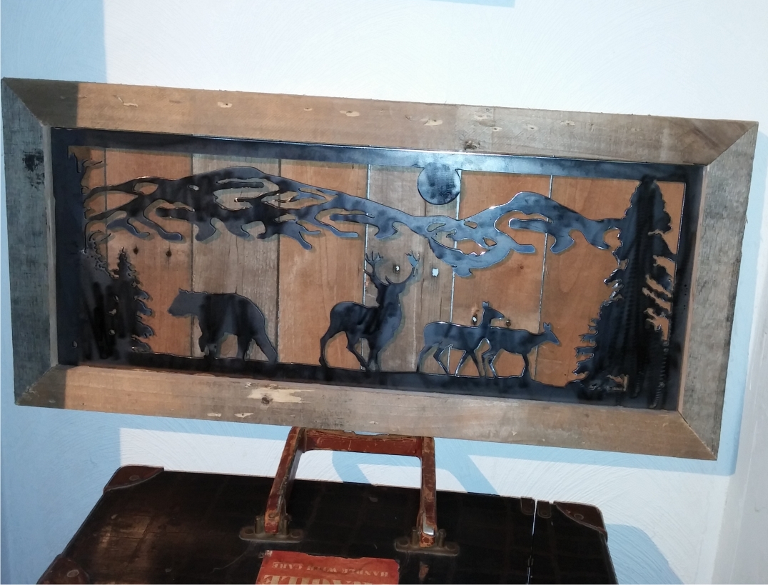 metal cut out tree with reclaimed wood backdrop finished with